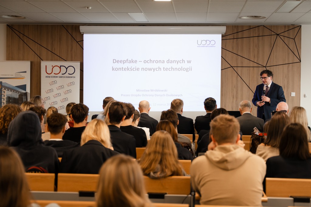 Mirosław Wróblewski podczas otwierającego wydarzenie wykładu przedstawił problem ochrony danych w kontekście nowych technologii na przykładzie zjawiska deepfake’ów. Wskazał, że jest to forma niewłaściwego wykorzystywania danych osobowych (np. wizerunku i głosu) najczęściej stosowana w celu oszustwa – a wzrost skali powoduje rosnącą presję na organy nadzorcze, by szybko reagowały. Prezes UODO przypomniał przebieg głośnej skargi na wykorzystywanie reklam deepfake z wizerunkiem polskich obywateli na platformach koncernu Meta. Sprawa ta zrodziła pytanie o to, czy platformy cyfrowe powinny być traktowane jako współadministratorzy danych we wszystkich płatnych reklamach zawierających dane osobowe.