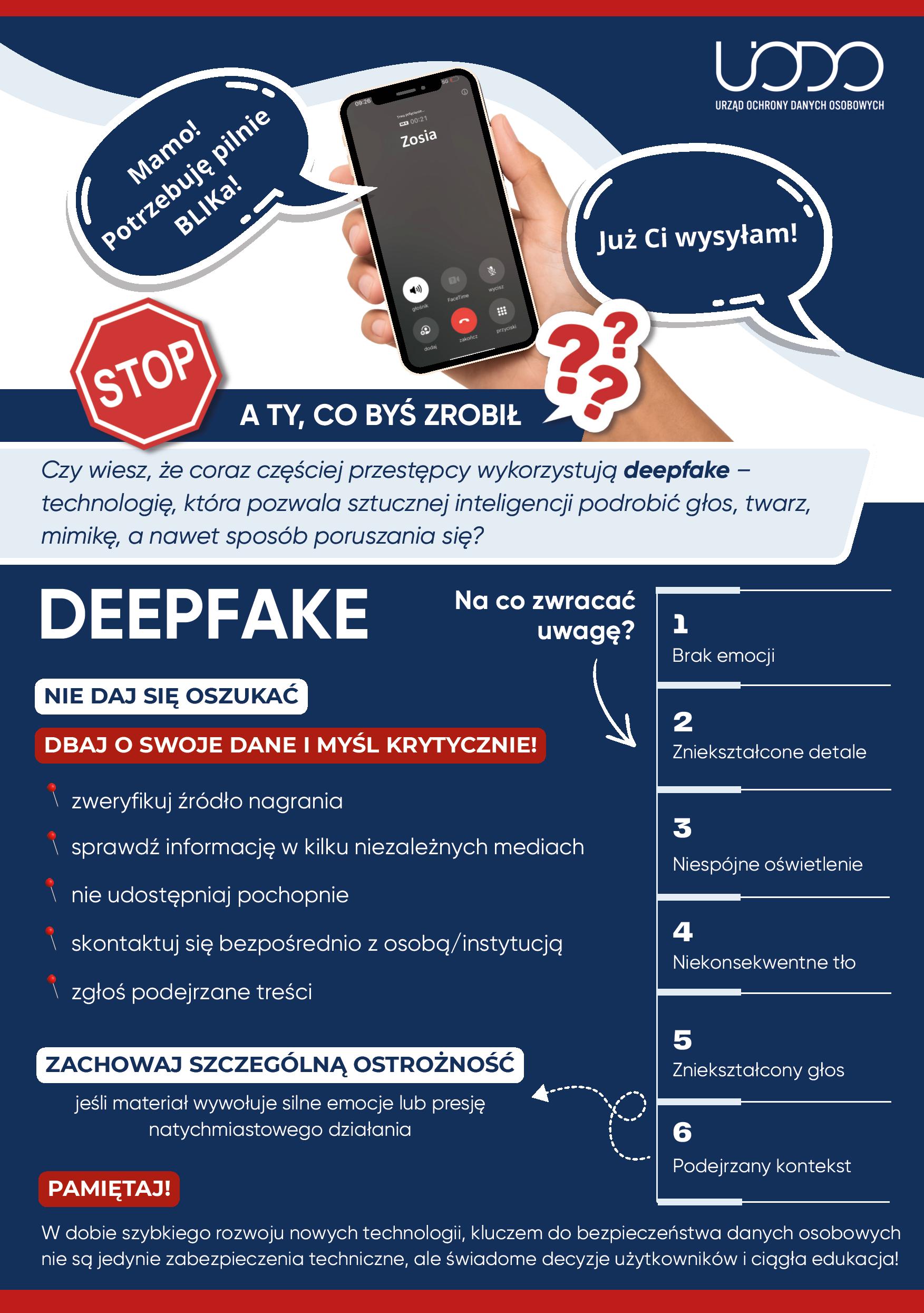 Czy wiesz, że coraz częściej przestępcy wykorzystują deepfake – technologię, która pozwala sztucznej inteligencji podrobić głos, twarz, mimikę, a nawet sposób poruszania się?